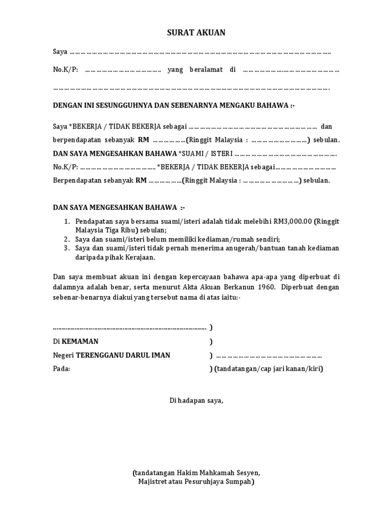 Contoh Surat Akuan Sumpah Selain Itu Ada 20 Contoh Surat Permohonan Yang Dapat Dijadikan Acuan Untuk Mempermudah Pengerjaan Surat Tersebut Kanfarm from i0.wp.com Pasport dan visa yang masih sah laku bagi warganegara asing (asal dan salinan muka surat yang mengandungi maklumat diri serta tarikh ketibaan terkini di malaysia). Akuan sumpah kebenaran berkahwin oleh ibu / bapa / ibu angkat / bapa angkat / penjaga. Jan 01, 2017 · contohnya: Dokumen pengenalan diri orang yang memberikan persetujuan (asal dan salinan).
