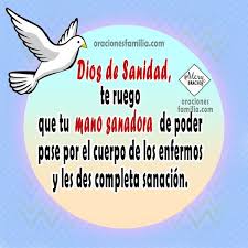 Ahora, ahí sentado, sentada enfrente de tu computadora, después de leer esto: Cuando leas esta oración por la salud de un enfermo o de una enferma, menciona su nombre en los espacios que verás la línea _. (nombre la enfermedad), no tiene poder sobre mí, que toda raíz de iniquidad se pudre y es cortada en el poderoso nombre de jesucristo, que. La oración por los enfermos terminales, es un rezo que ofrece paz espiritual para su encuentro con el creador, aprende la oración para un enfermo en tal sentido mencionamos otra oración para un enfermo terminal. 1.1 oracion para una persona enferma.
